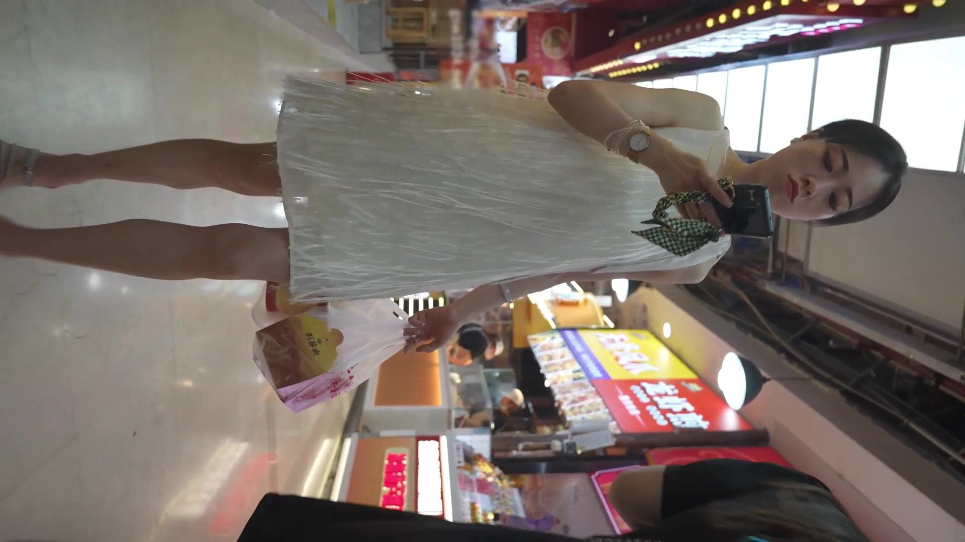 大神美食街跟踪偷拍 通透露肩裙买小吃美女裙底风光透心凉CD浅绿内裤屁股缝