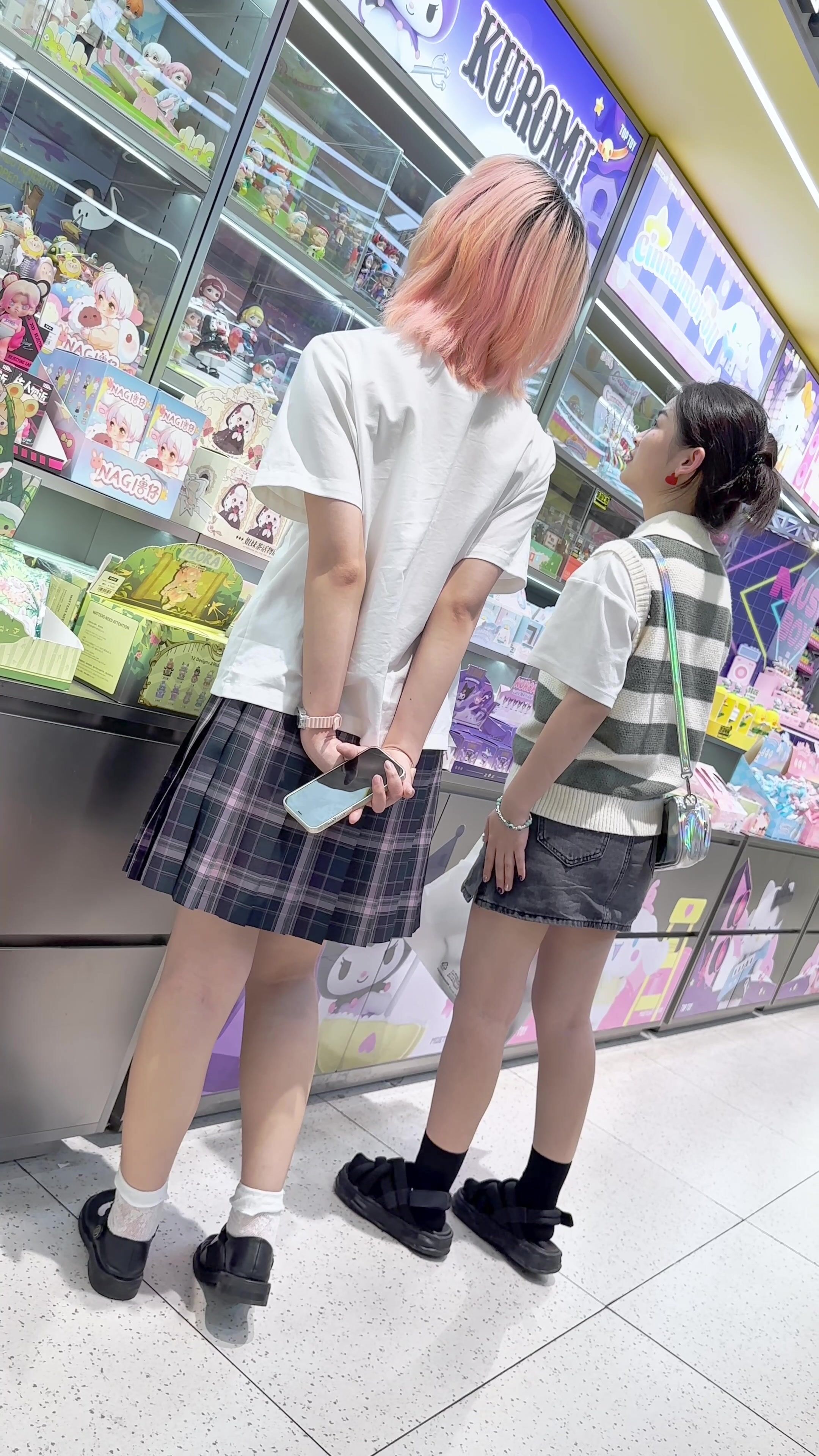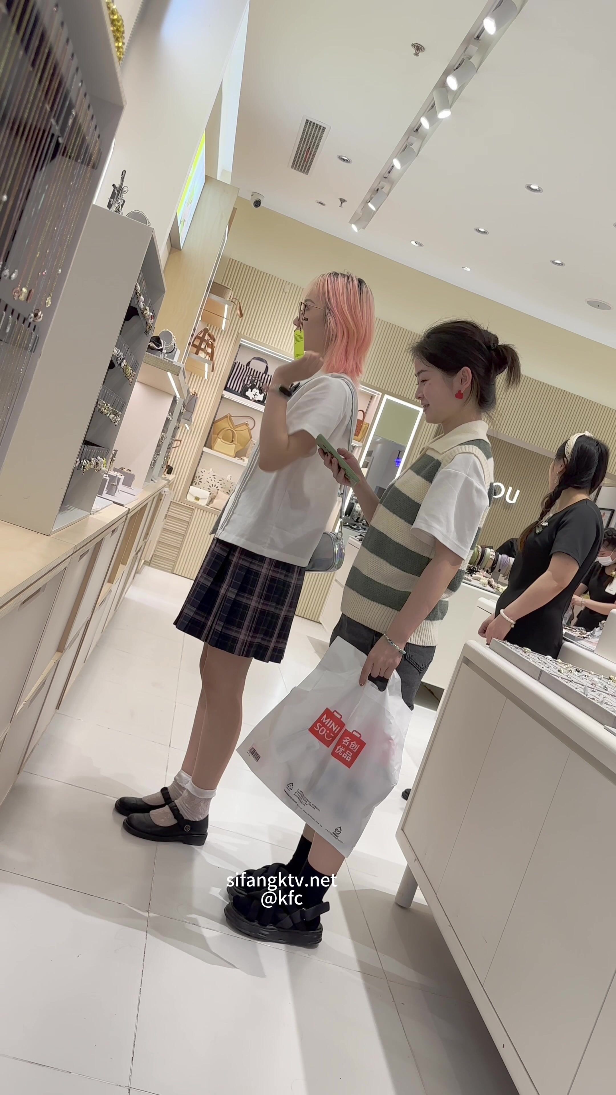 JK制服精神小妹和闺蜜逛街。短裙白色内内低角度CD.